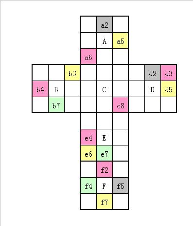 ‘c8=a,棱DE =>d6d7d8<>a.’ 表示 ‘c8为a,c8与d6d7d8在棱DE上,据技巧1.2,则d6d7d8不能为a。’